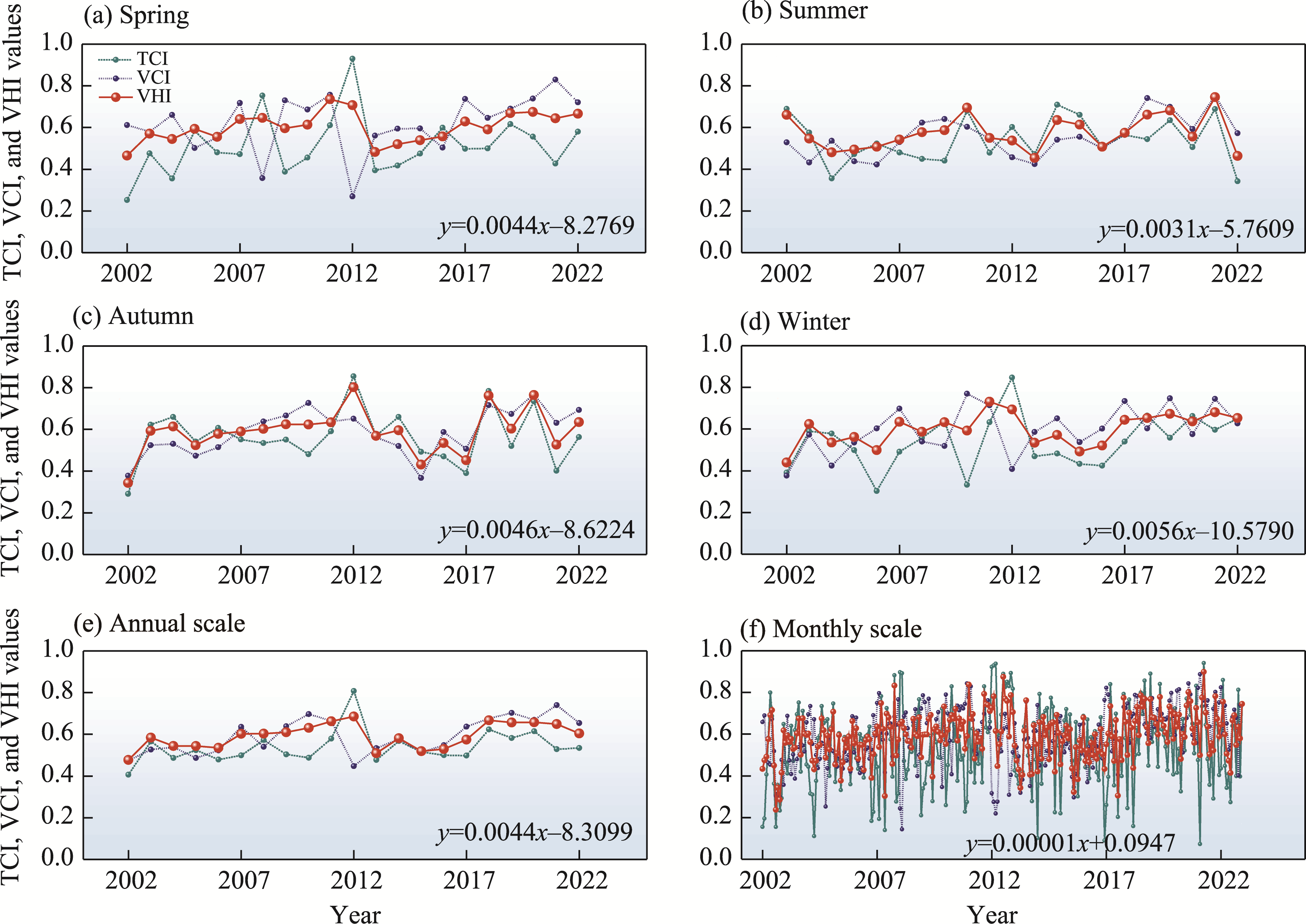 Fig. 2 Changes in TCI (Temperature Condition Index), VCI (Vegetation Condition Index), and VHI (Vegetation Health Index) at different time scales in the Yellow River Basin from 2002 to 2022. (a), spring; (b), summer; (c), autumn; (d), winter; (e), annual scale; (f), monthly scale. The abbreviations are the same as in the following figures.