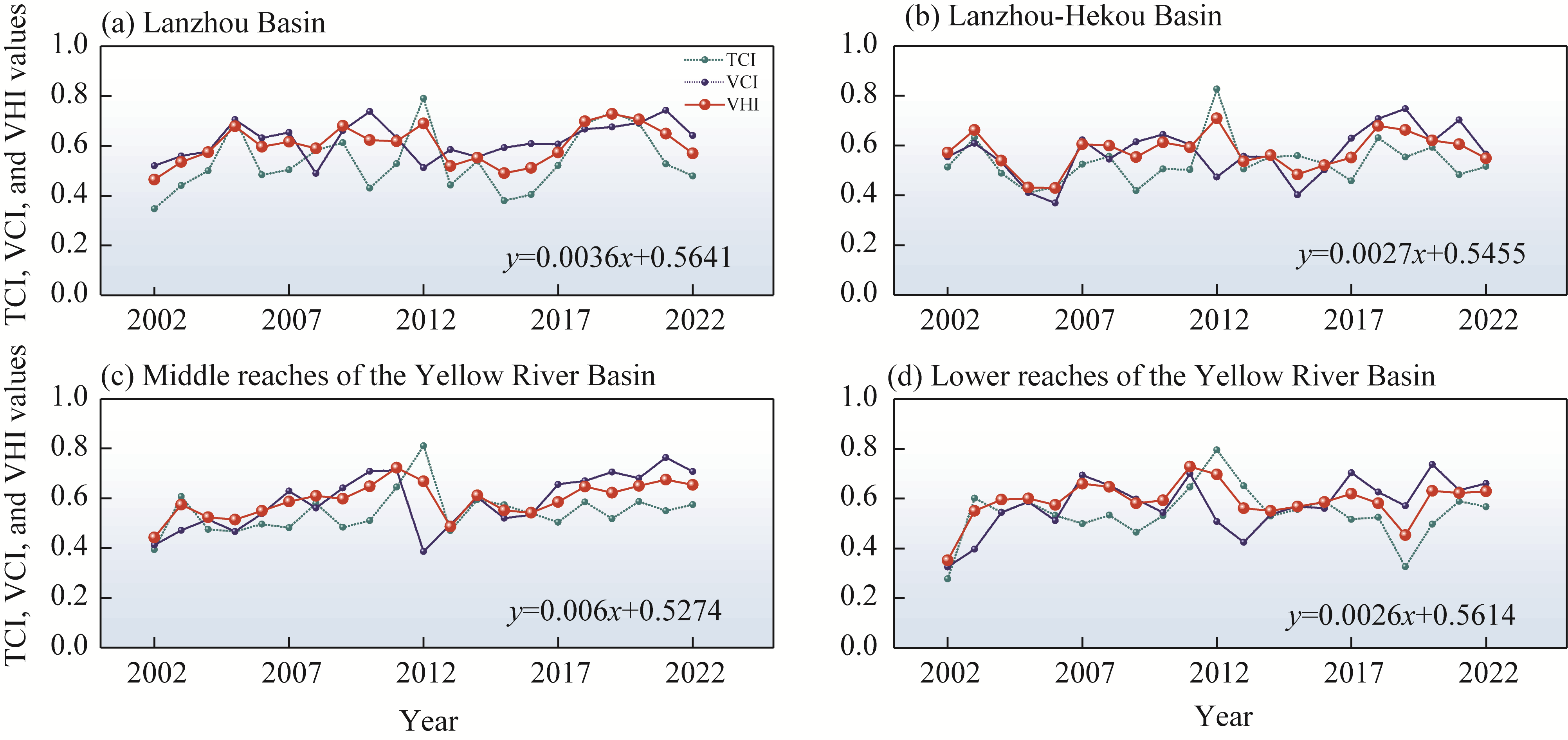 Fig. 3 Annual trends of TCI, VCI, and VHI across different sub-basins in the Yellow River Basin from 2002 to 2022. (a), Lanzhou Basin; (b), Lanzhou-Hekou Basin; (c), middle reaches of the Yellow River Basin; (d), lower reaches of the Yellow River Basin.