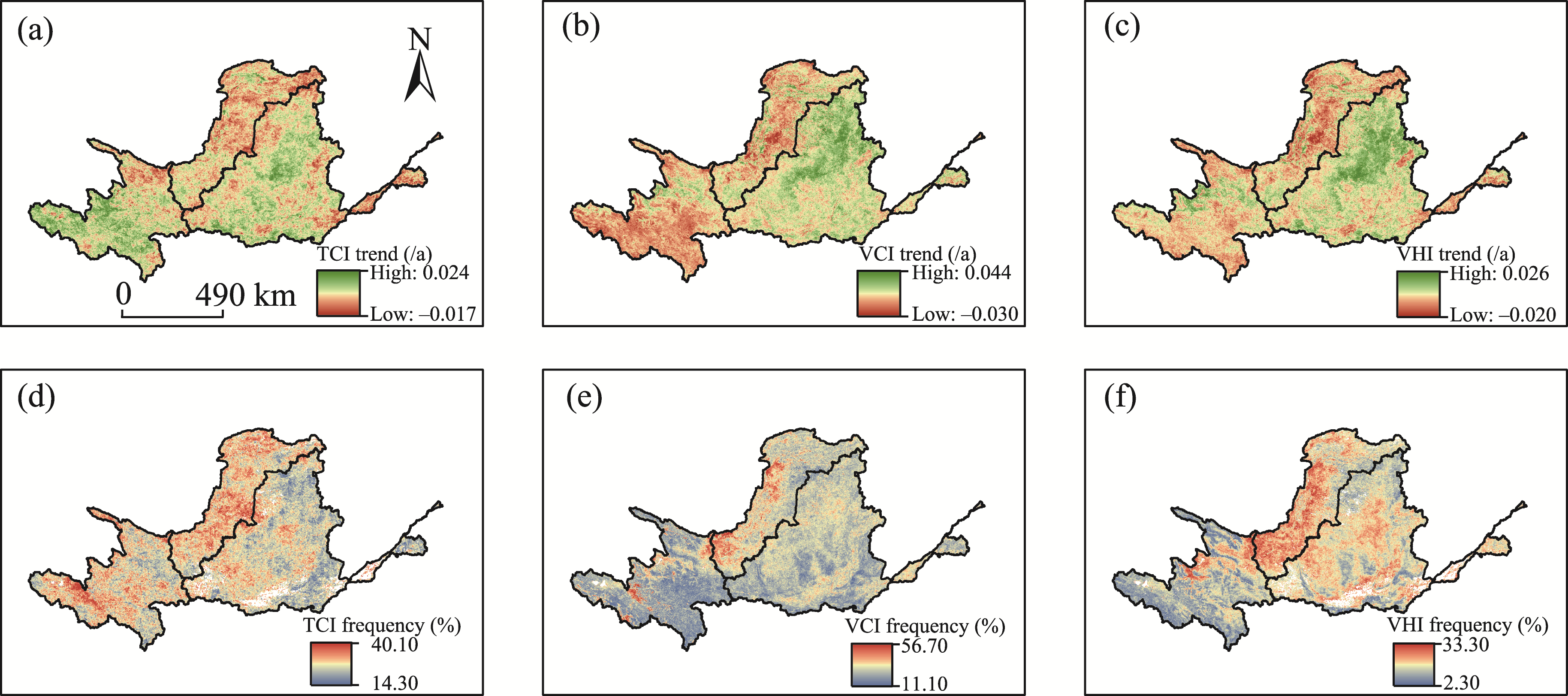 Fig. 5 Drought trends (a-c) and frequency (d-f) distributions of TCI, VCI, and VHI in the Yellow River Basin from 2002 to 2022