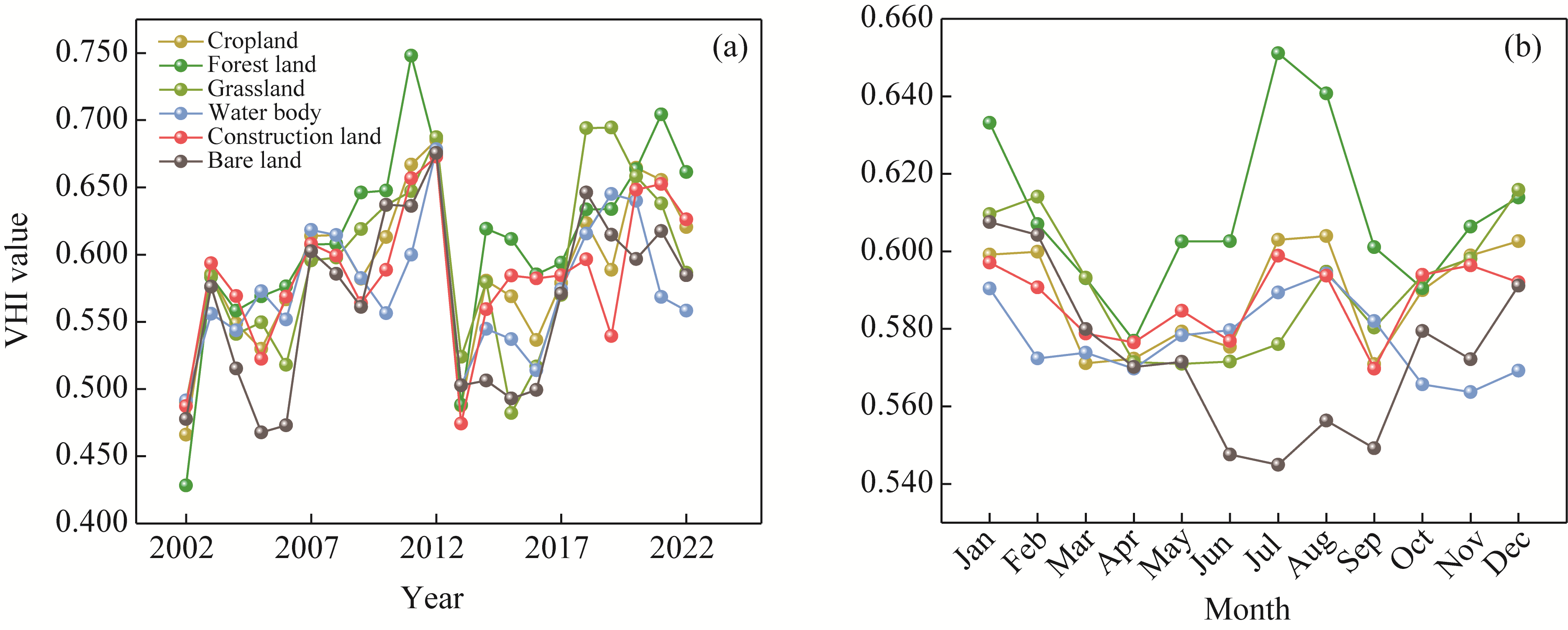 Fig. 6 Changes in annual (a) and monthly (b) VHI for each land use type in the Yellow River Basin from 2002 to 2022