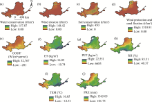 Fig. 7 Factors affecting VHI in the Yellow River Basin. (a), water conservation; (b), wind erosion; (c), soil conservation; (d), wind protection and sand fixation; (e), GOSIF (solar-induced chlorophyll fluorescence); (f), ET (evaporation); (g), PET, (potential evaporation); (h), RH (relative humidity); (i), TEM (temperature); (j), PRE (precipitation). The abbreviations are the same as in the following table.