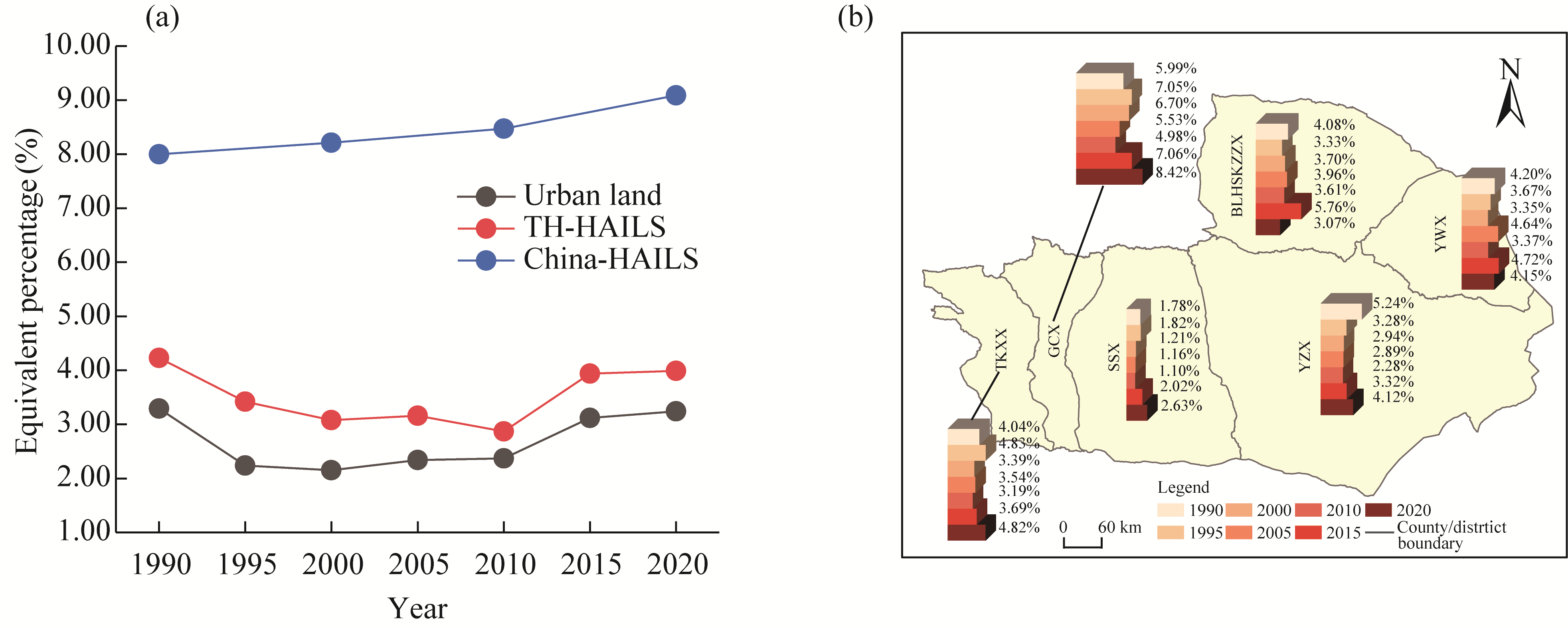 Abstract The Turpan-Hami (Tuha) Basin of China, a critical region on the Silk Road Economic Belt and a major national energy base, occupies a significant position in energy security and in the major industrial clusters in Xinjiang Uygur Autonomous Region, China. Understanding spatial and temporal evolution of human activities in this area is essential for harmonizing ecological protection with energy development, safeguarding the ecological security of the Silk Road Economic Belt, and promoting the sustainable development of the area. However, despite rapid socioeconomic advances, the trajectories of human activity intensity and the principal driving mechanisms over the past three decades remain inadequately understood. To address these gaps, this study constructed a land use dataset for the Tuha Basin from 1990 to 2020, utilizing Google Earth Engine (GEE) and random forest classification algorithm. We assessed the intensity of human activities and their spatial autocorrelation patterns and further identified key drivers influencing spatial and temporal variations using the Geodetector model. Our findings indicated that the intensity of human activities in the Tuha Basin has exhibited a "first decline and then recovery" trend over the past 30 a, accompanied by significant spatial clustering. In recent years, the aggregation of hot spots has diminished, while clustering of cold spots has intensified, suggesting a dispersion of human activity centers. Nevertheless, urban areas in the Hami and Turpan cities, along with their surrounding areas, continued to serve as core areas of human activities. Topographic features (slope gradient and aspect) and their interactions with economic variables emerged as dominant determinants shaping the spatial patterns and temporal dynamics of human activity intensity. This result provides critical insights into fostering sustainable regional development and ecological conservation in the Tuha Basin and offers valuable methodological and empirical references for studies on land use dynamics and human activity intensity in similar arid areas.