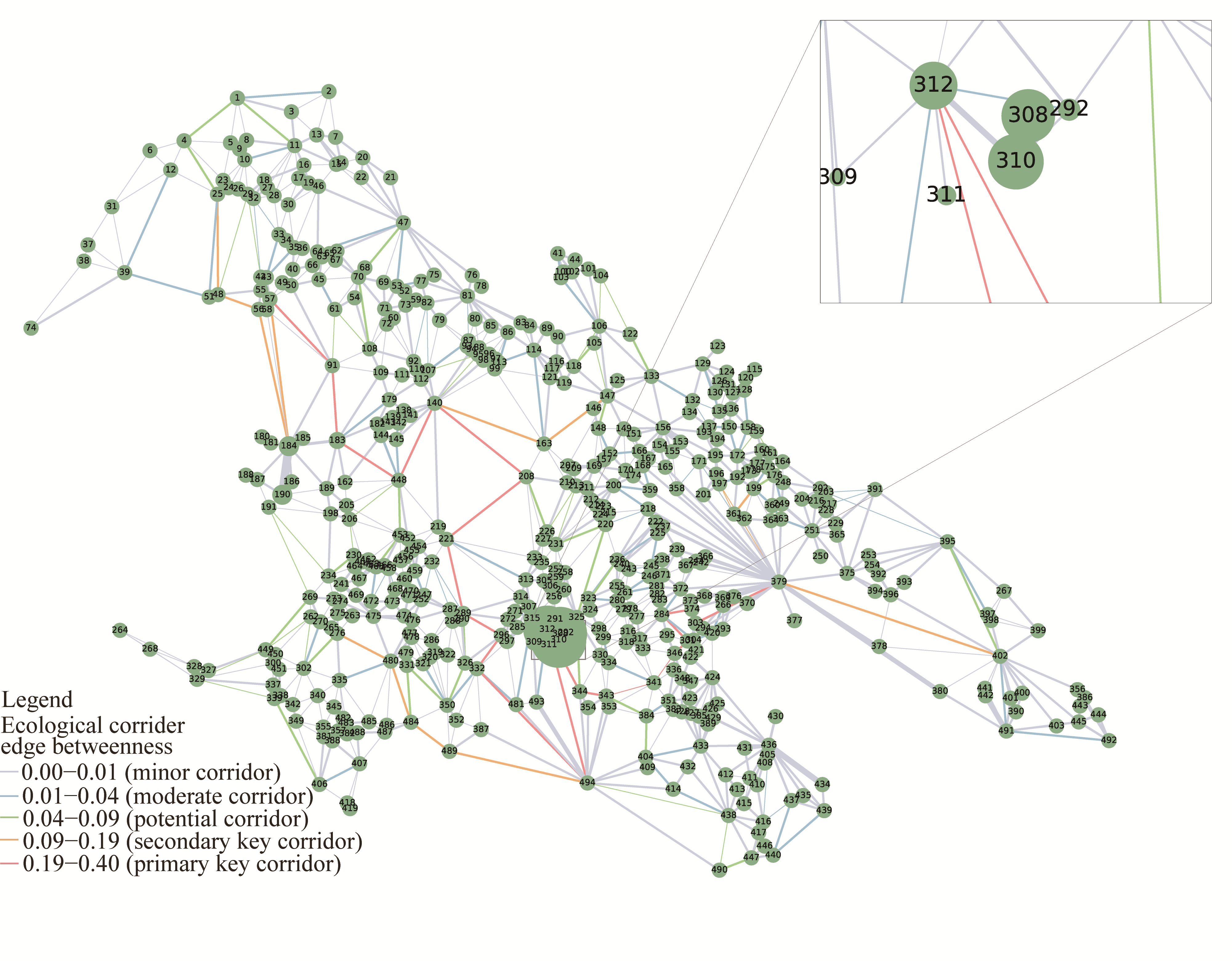 Luo Y H, Wu J S. 2021. Linking the minimum spanning tree and edge betweenness to understand arterial corridors in an ecological network. Landscape Ecology, 36(5): 1549-1565.