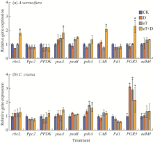 Abstract Rising temperatures and increased droughts caused by climate change significantly reduce crop yields. Halophytes with different photosynthetic metabolism types have specific mechanisms for resistance to climatic factors. This study analyzed the morphophysiological, biochemical, and molecular-genetic mechanisms of tolerance and adaptation in halophytes, promising candidates for the restoration of salt affected lands in arid and semi-arid areas. Experiments under drought (D) and elevated temperature (eT), as well as their combined action (eT+D), were performed on Atriplex verrucifera M. Bied. (C3 plant) and Climacoptera crassa (M. Bieb.) Botsch. (C4-NAD-ME plant) with different types of photosynthesis. The activity of photosystem I (PSI) and the efficiency of photosystem II (PSII) were measured, along with the expression of genes involved in the light (psaA, psaB, psbA, CAB, Fd1, PGR5, and ndhH) and dark (rbcL, Ppc2, and PPDK) reactions of photosynthesis. The content of key carboxylating enzymes ribulose-1,5-bisphosphate carboxylase/oxygenase (Rubisco) and phosphoenolpyruvate carboxylase (PEPC), as well as the photorespiration enzyme glycine decarboxylase (GDC), were assessed. Plant growth and water-salt balance parameters, and activity of enzymes in the malate dehydrogenase (MDH) system nicotinamide adenine dinucleotide (phosphate) (NAD(P))-MDH and NAD(P)-malic enzyme (ME) were also examined. A multivariate analysis of the experimental results revealed that A. verrucifera and C. crassa were both resistant to the effects of these climatic stressors. The tolerance mechanisms of both species were significantly influenced by a high level of photosynthetic plasticity. Nevertheless, differences were observed in the protective mechanisms underlying tolerance. In the C3 species, dissipative processes associated with non-photochemical quenching (NPQ) of PSII and MDH system enzymes (malate valves) were activated, particularly under osmotic stress. The negative effects in the C3 plants were caused by the combined action of eT+D, which was compensated by an increased expression of rbcL, psaA, CAB, and especially PGR5, i.e., genes encoding Rubisco large subunit and PSI components: apoproteins A, chlorophyll a/b-associated protein (CAB) of light-harvesting complex, and proton gradient regulation 5 (PGR5) protein of the main pathway of cyclic electron transport (CET) around PSI. In C4 species, the protective MDH complex was expressed to a lesser extent, but activation of the C4 carbon-concentrating mechanism (CCM) and upregulation of PGR5 expression were observed, particularly under the individual action of the factors. Under the combined stress of eT+D, C. crassa exhibited a synergistic effect, where the increase in NPQ level and NAD-ME activity, as well as decrease in NADP-ME activity was less pronounced compared with the effect of singular factors. Comparative physiological, biochemical, and molecular analyses of how C3 and C4 species response to individual and combined climatic factors provide new insights into sustainable plant adaptation strategies in the face of global climate change. Considering the high nutritional value of these two fodder species, a technological approach could be developed to improve the productivity of salt affected lands.