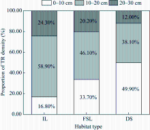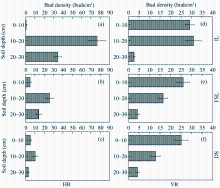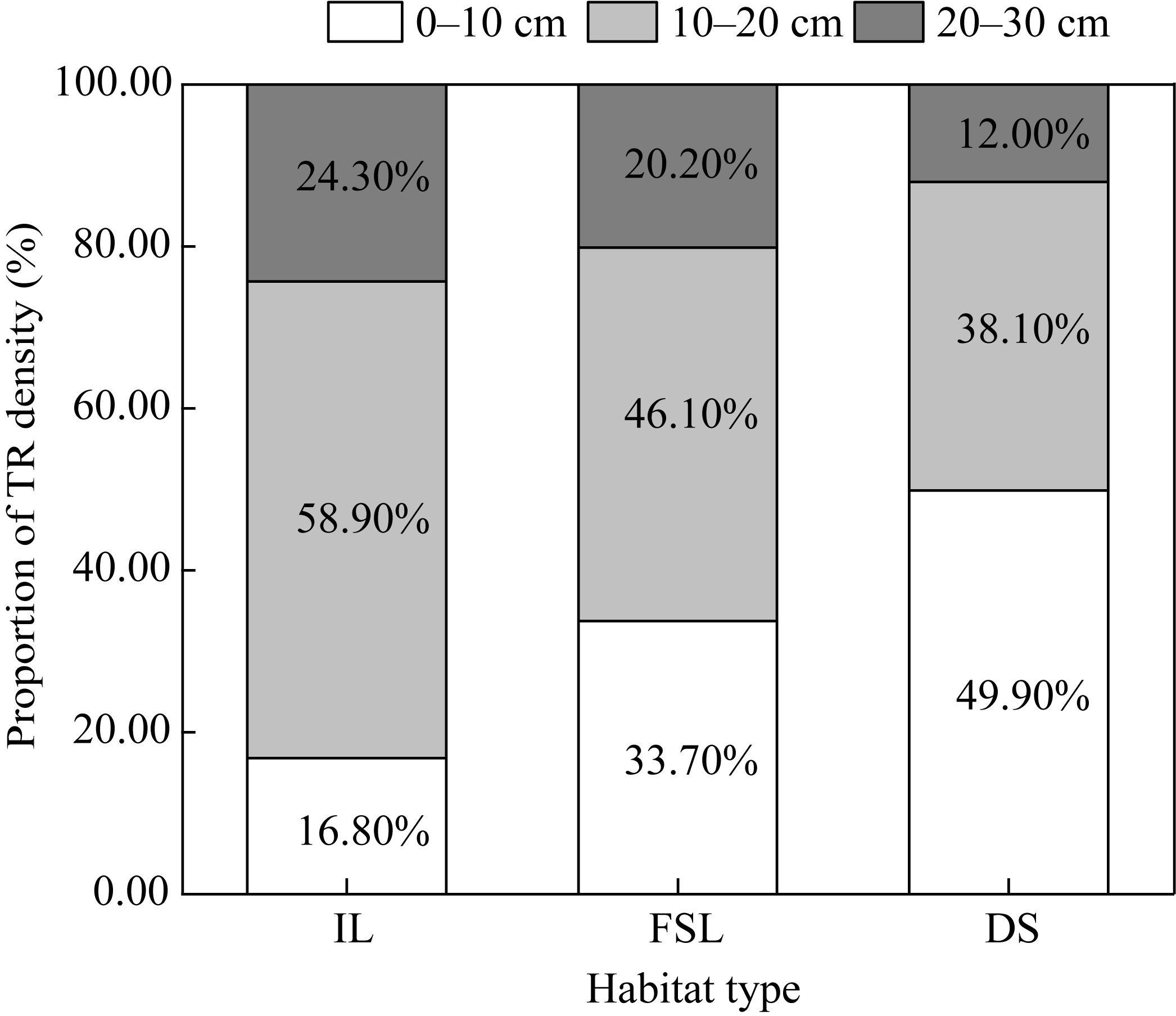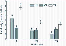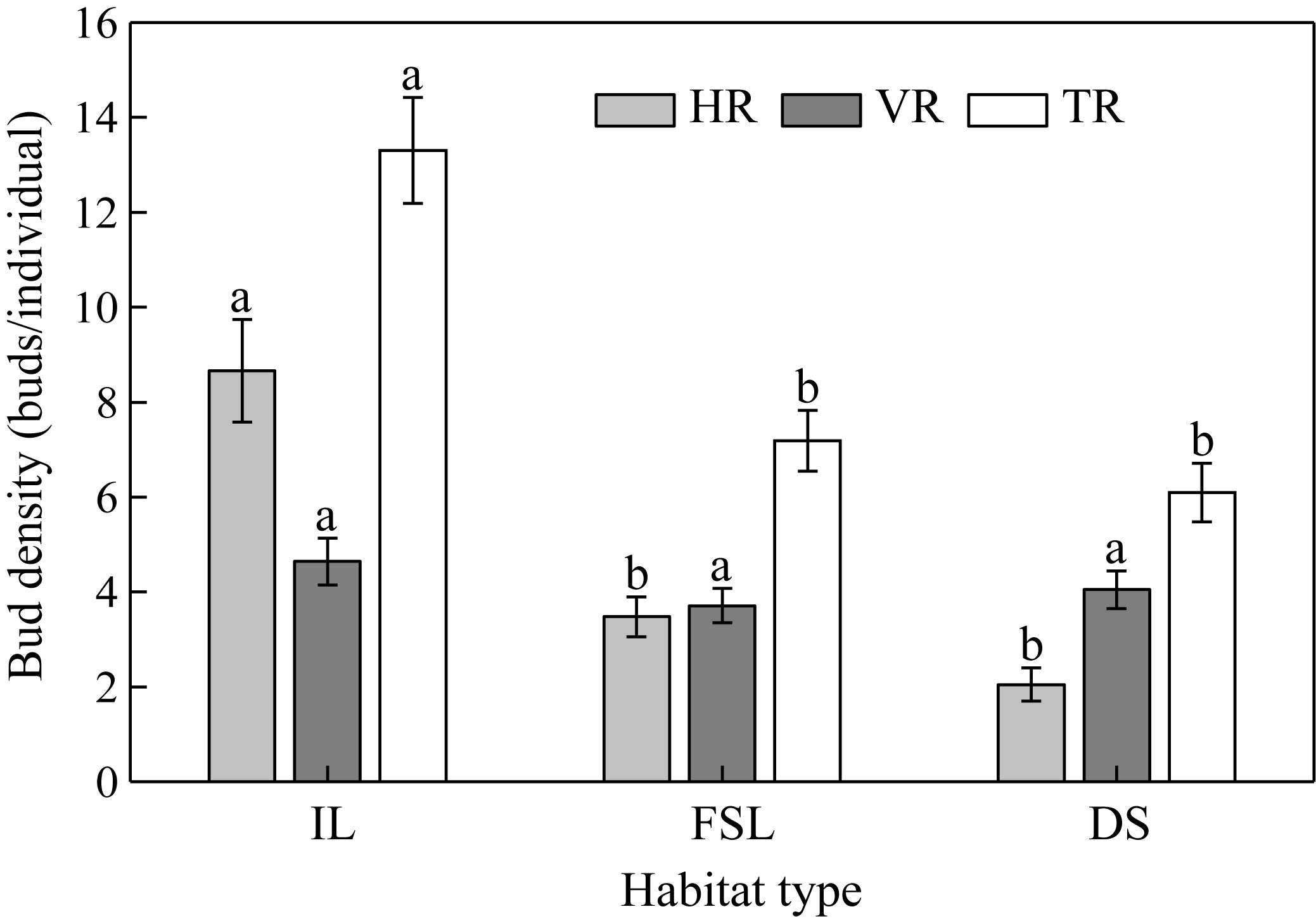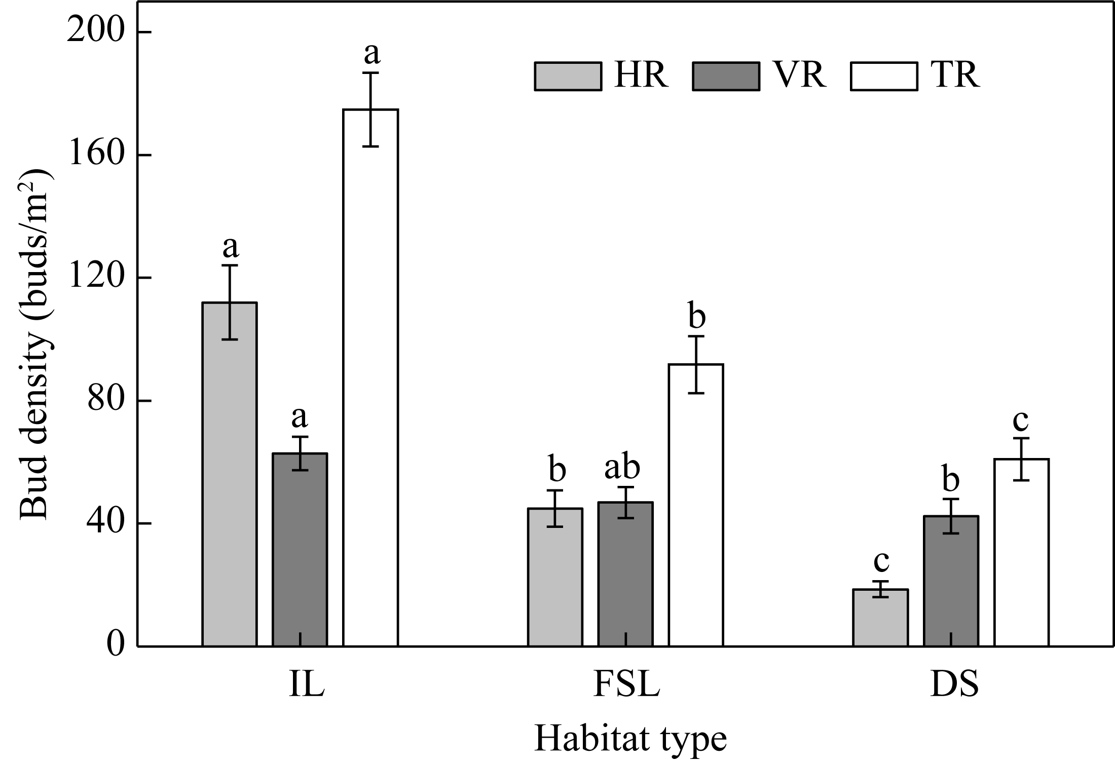 Abstract Belowground bud banks are essential for the regeneration of plant population in arid desert areas, and their response to environmental changes could reflect adaptive strategies of plants to desert habitats. However, the size and composition of belowground bud banks and their response to environmental factors in the desert steppe zone remain poorly understood, challenging desertification control efforts in arid desert areas. This study examined the density and vertical distribution of horizontal and vertical rhizome buds of a rhizomatous legume herb Sophora alopecuroides L., its population characteristics, and soil physical-chemical properties in three habitats (interdune lowland (IL), flat sandy land (FSL), and desert steppe (DS)) in a desert steppe zone, northern China. Our findings revealed that: (1) total and horizontal rhizome bud densities of S. alopecuroides differed significantly among the three habitats (P<0.05), with the largest total rhizome bud density (177 buds/m2) in IL and the smallest (63 buds/m2) in DS; (2) horizontal rhizome buds distributed in the deep soil layer were dominant in IL, while vertical rhizome buds in the top soil layer were predominant in DS; and (3) soil coarse sand, nutrient content, and population density were the primary factors affecting bud bank density of S. alopecuroides. Specifically, horizontal rhizome buds were dependent largely on soil coarse sand content, and vertical rhizome buds tended to be more related to soil organic matter content and population density. Our results indicated that horizontal rhizome buds were more important in IL with frequent aeolian disturbance, whereas vertical rhizome buds were more important in DS with abundant water and nutrient resources. The plastic responses and survival strategies of S. alopecuroides bud bank to different habitats provide valuable information for the effective implementation of desertification control measures and the management of desert steppe ecosystems.