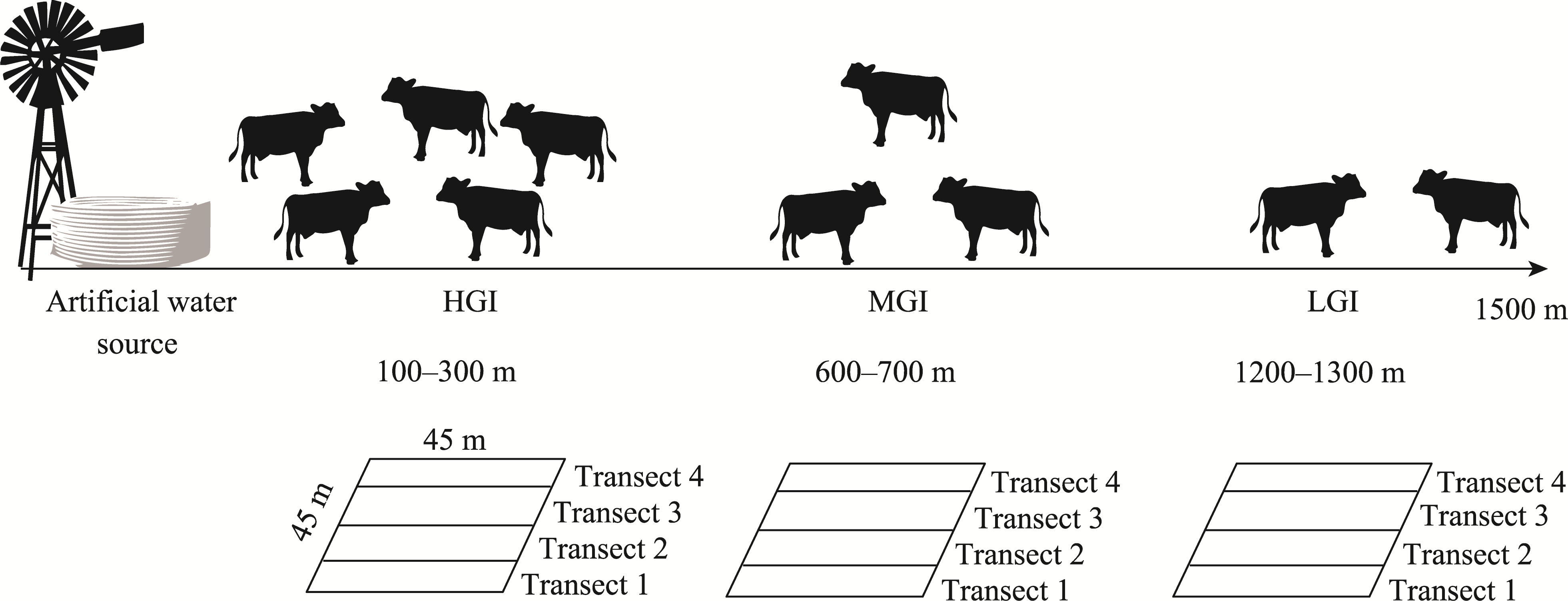 Fig. 2 Graphical representation of grazing intensity versus distance to the artificial water source and the corresponding transect design. HGI, high grazing intensity; MGI, medium grazing intensity; LGI, low grazing intensity.