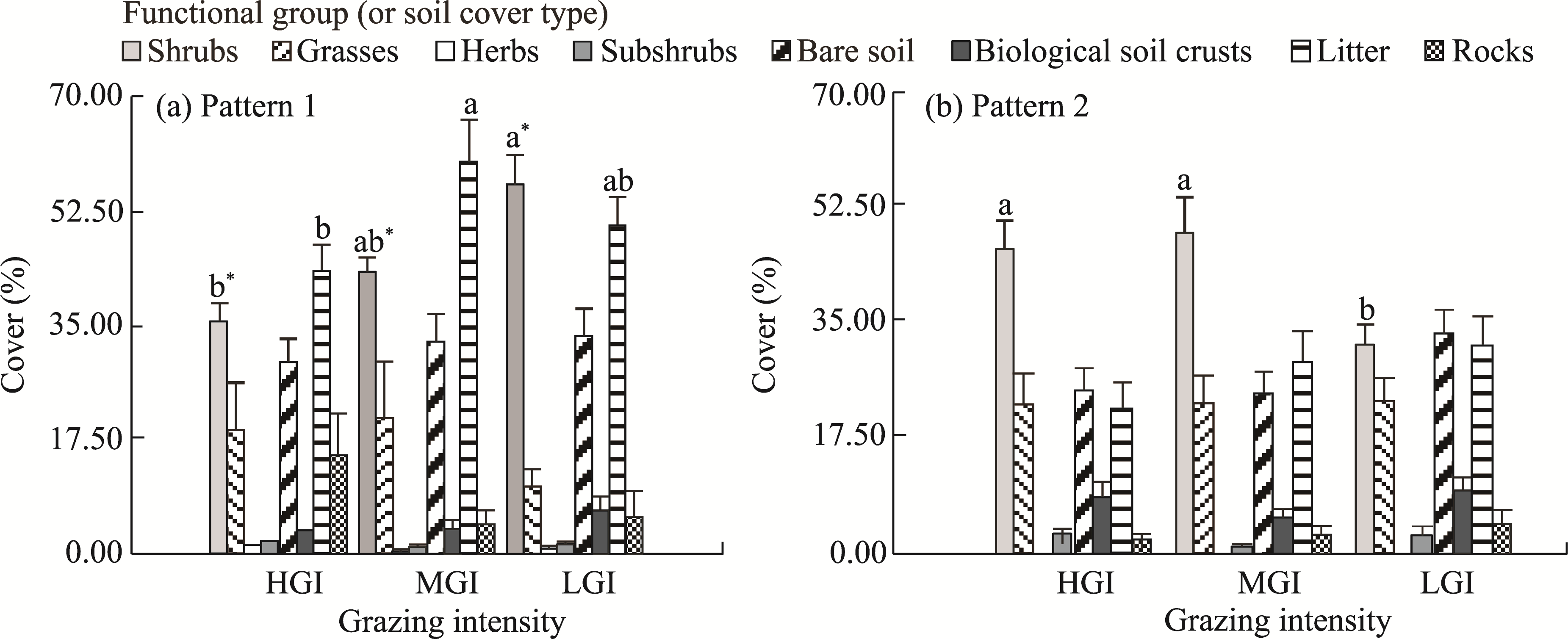 Fig. 4 Variation in the cover of each functional group and soil cover type among different grazing intensities in piospheres under Pattern 1 (a) and Pattern 2 (b). Pattern 1 showed an increase in Normalized Difference Vegetation Index (NDVI) with distance from the artificial water source, indicating a negative response of vegetation productivity to the pressure exerted by livestock; Pattern 2 showed an inverse response with a decrease in NDVI as the distance to the water source increased. Different letters indicate statistically significant differences (P<0.050) among intensities for the cover of each functional group and soil cover type. Bars are standard error. Significances marked with * belong to a statistically distinct group.