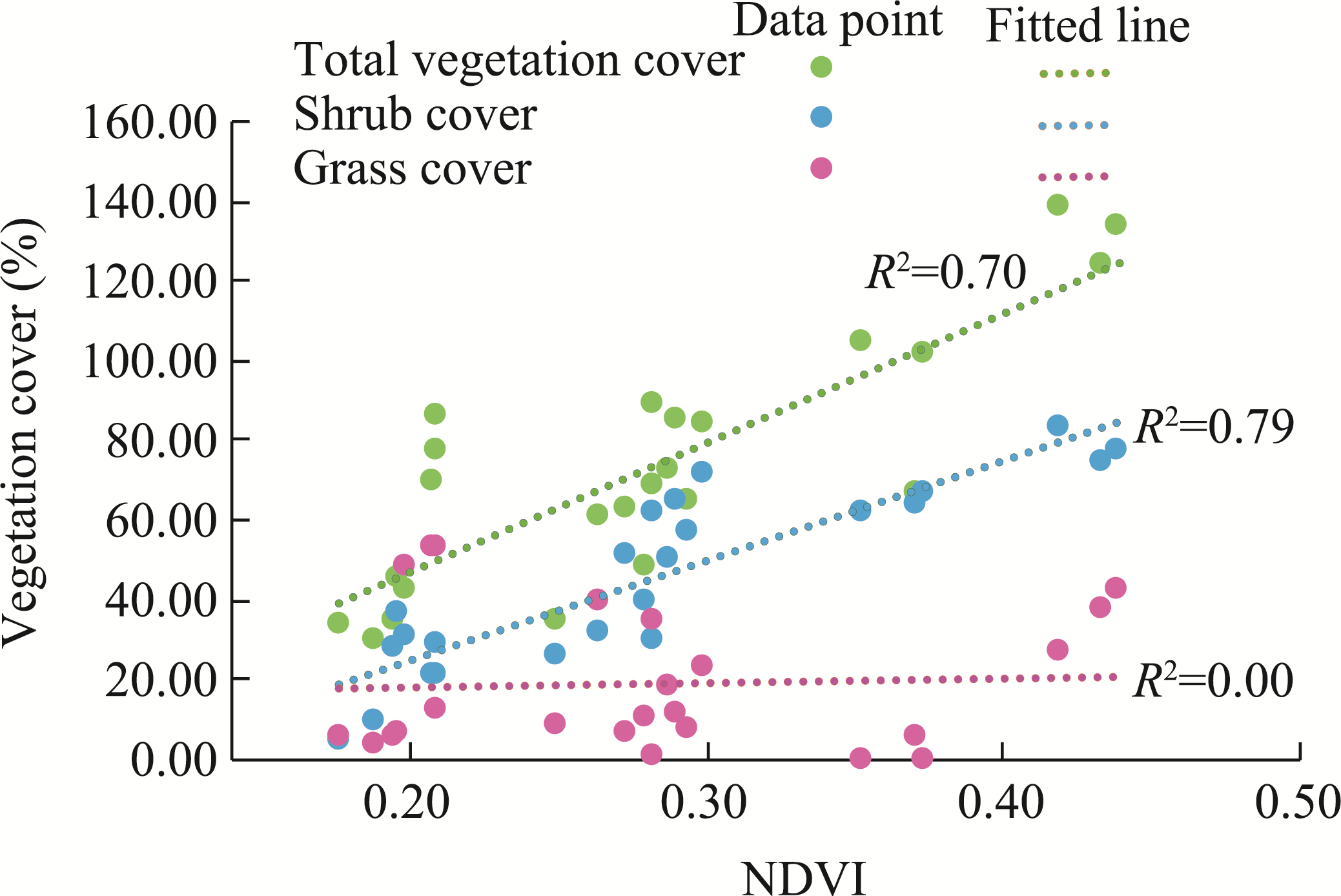 Fig. 5 Relationship of NDVI with total vegetation cover, shrub cover, and grass cover