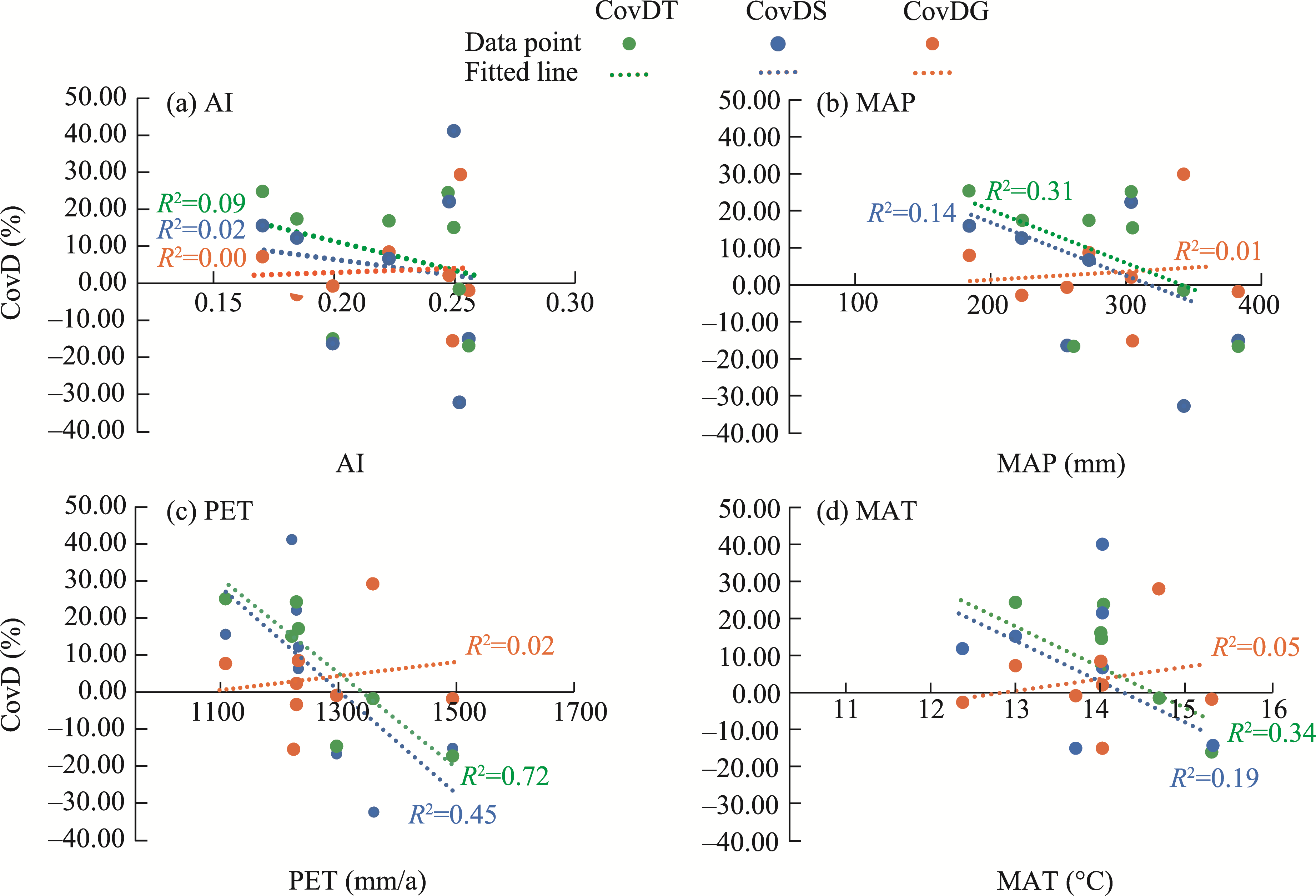 Fig. 7 Relationships between the CovD of different vegetation types with AI (a), MAP (b), PET (c), and MAT (d). AI, aridity index; MAP, mean annual precipitation; PET, potential evapotranspiration; MAT, mean annual temperature. CovDS, CovDG, and CovDT indicate the difference in cover (CovD) determined for shrubs, grasses, and total vegetation, respectively.