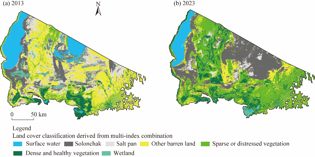 Abstract The South Aral Seabed is an extreme dryland ecosystem undergoing rapid transformation yet remains misrepresented or absent in global land cover datasets. Conventional vegetation indices, specifically the Normalized Difference Vegetation Index (NDVI), perform poorly in such environments due to their limited ability to distinguish sparse vegetation from highly reflective saline and sandy soils. This study evaluated the effectiveness of the Modified Soil Adjusted Vegetation Index (MSAVI) for improving land cover classification in the South Aral Seabed and conducted a decadal analysis of land cover change between 2013 and 2023 using Landsat 8 imagery (30 m resolution). A spectral index-based classification framework was developed, combining MSAVI with the Normalized Difference Water Index (NDWI) and Salinity Index 1 (SI1) to reduce spectral confusion between vegetation, saline soils, and surface water. The MSAVI-based classification achieved an overall accuracy of 77.96% (Kappa coefficient=0.71), supported by 313 field-collected validation points from 2023. While the multi-index approach enabled finer discrimination of ecologically important classes, particularly separating salt pans from solonchak soils, it resulted in a lower overall accuracy (73.80%), highlighting a trade-off between class separability and classification performance. Land cover change analysis revealed a highly dynamic landscape, with 52.96% of the study area transitioning between classes over the decade. Transformed areas (16,893 km2) exceeded stable zones (15,004 km2), driven primarily by rapid desiccation and salinization. Solonchak soils increased at an annual rate of 5.58%, while surface water bodies declined by 4.83% per year. Concurrently, sparse or distressed vegetation increased by 1.43% annually, reflecting ongoing afforestation efforts. This study provides the first MSAVI-based and medium-resolution land cover baseline for the South Aral Seabed and demonstrates that soil-adjusted vegetation indices are essential for reliable dryland classification where conventional indices fail. The proposed spectral index framework offers a replicable methodology applicable to other global drylands facing similar land degradation and restoration challenges.