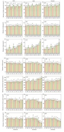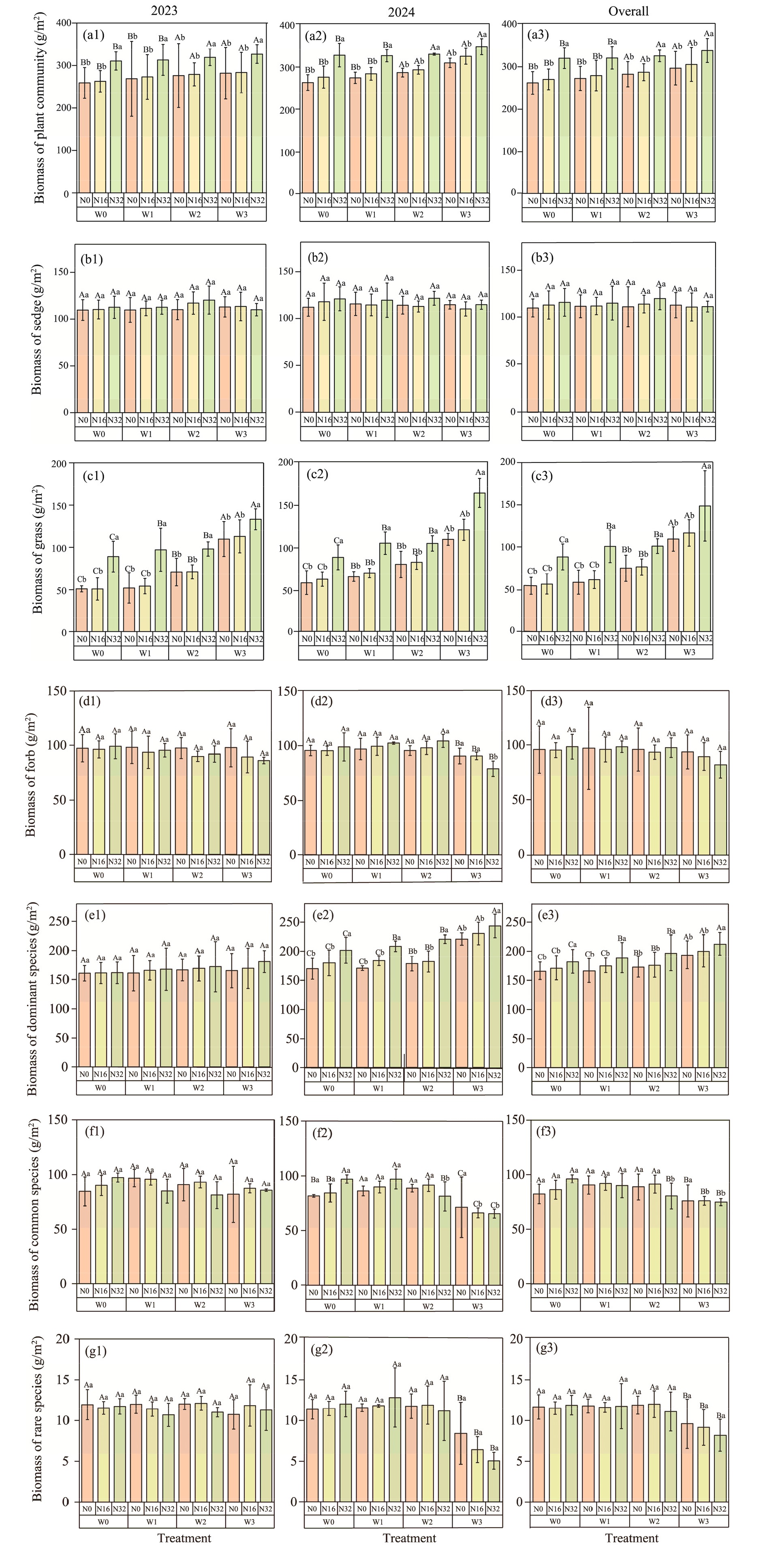 Fig. 2 Effects of warming and nitrogen deposition on plant biomass. (a1-a3), biomass of plant community; (b1-b3), biomass of sedge; (c1-c3), biomass of grass; (d1-d3), biomass of forb; (e1-e3), biomass of dominant species; (f2-f3), biomass of common species; (g1-g3), biomass of rare species. N0, 0 kg N/(hm2•a); N16, 16 kg N/(hm2•a); N32, 32 kg N/(hm2•a). Different uppercase letters within the same nitrogen treatment indicate significant differences among different climate waring treatments at P<0.050 level. Different lowercase letters within the same climate warming treatment indicate significant differences among different nitrogen treatments at P<0.050 level. Bars are standard errors. The abbreviations and the meanings of uppercase and lowercase letters are the same as in the following figure.