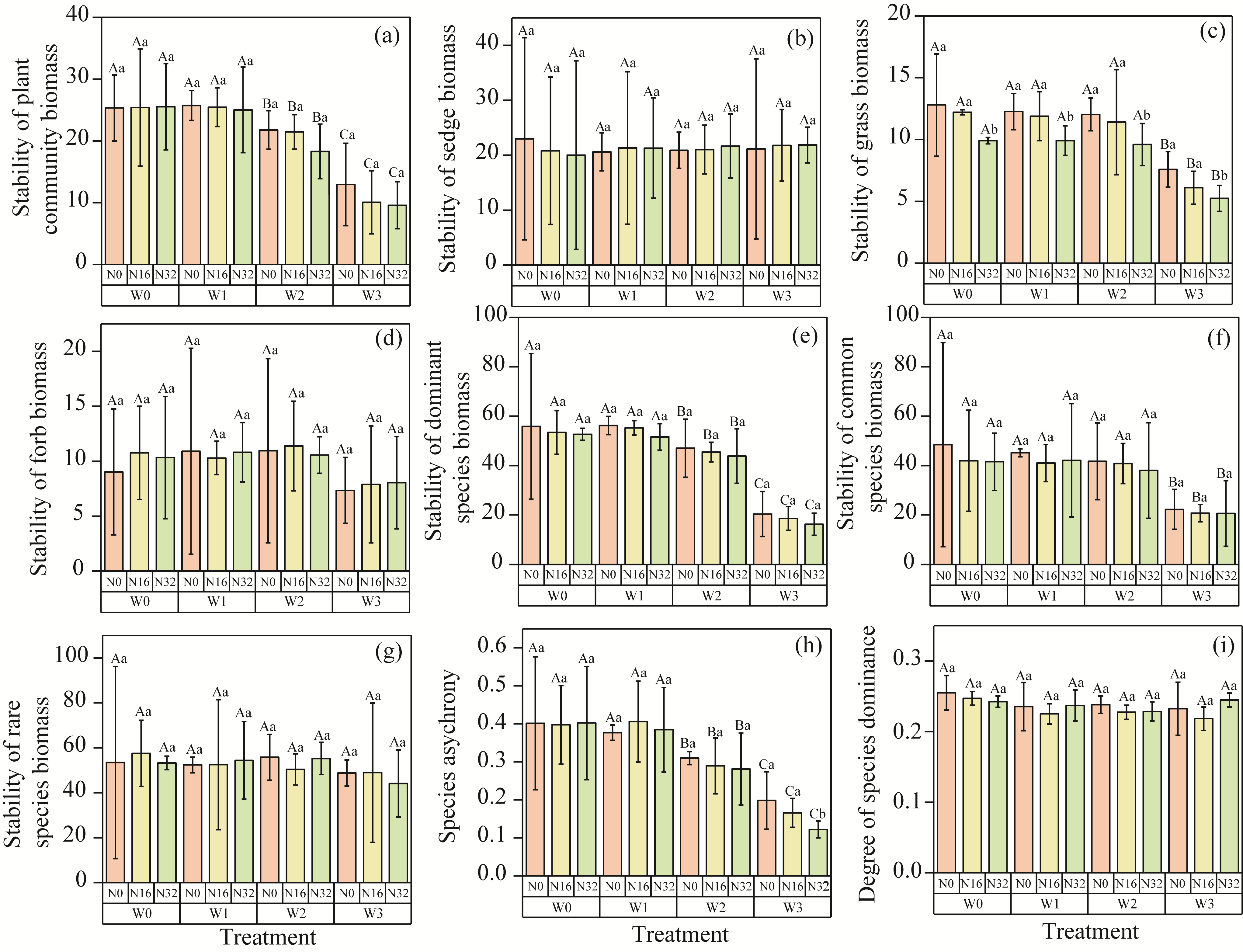 Fig. 3 Effects of climate warming and nitrogen deposition on temporal biomass stability. (a), stability of plant community biomass; (b), stability of sedge biomass; (c), stability of grass biomass; (d), stability of forb biomass; (e), stability of dominant species biomass; (f), stability of common species biomass; (g), stability of rare species biomass; (h), species asynchrony; (i), degree of species dominance.