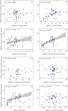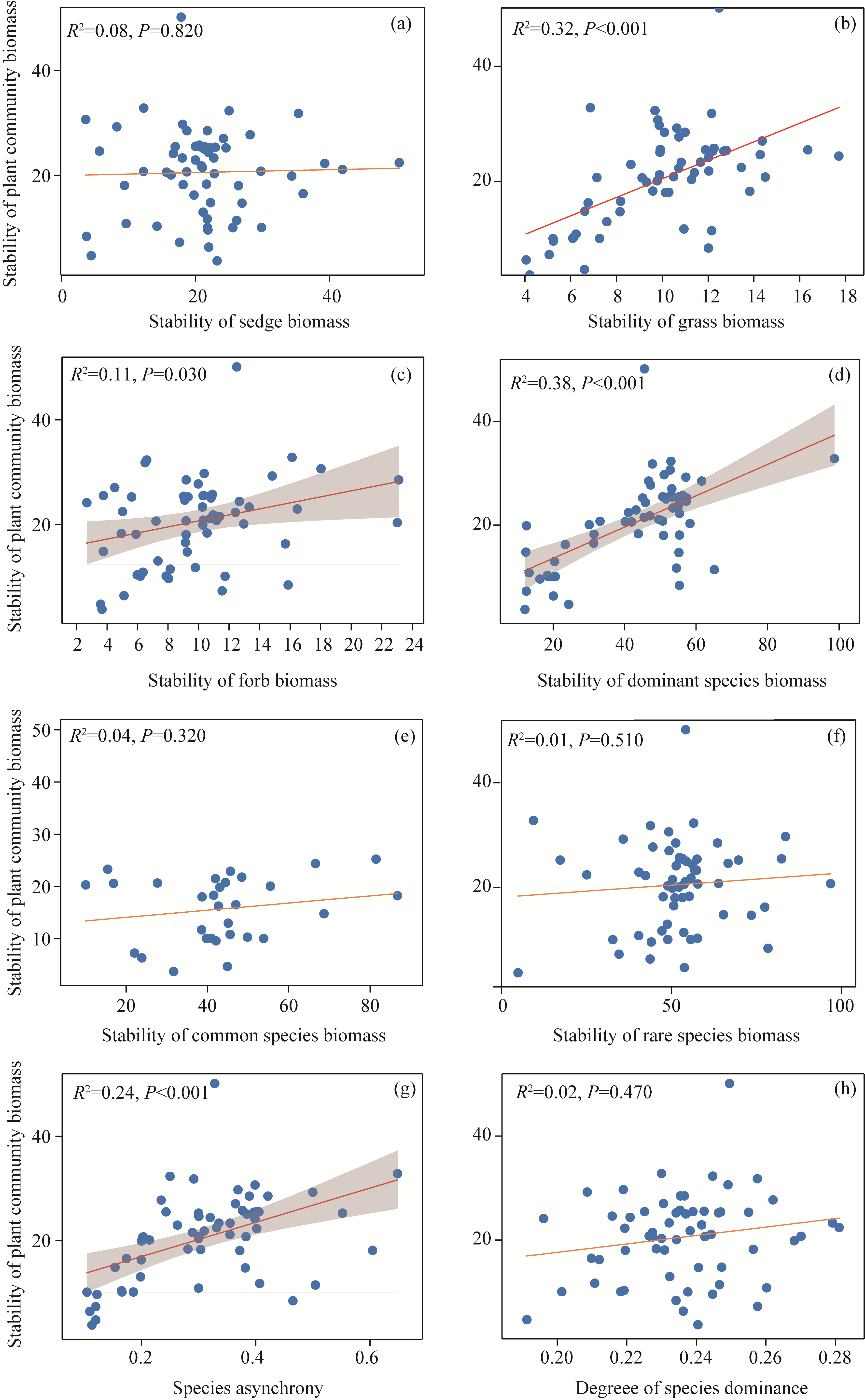 Fig. 4 Relationships between stability of plant community biomass and various predictive factors. (a), stability of sedge biomass; (b), stability of grass biomass; (c), stability of forb biomass; (d), stability of dominant species biomass; (e), stability of common species biomass; (f), stability of rare species biomass; (g), species asynchrony; (h), degree of species dominance. The shaded area denotes the 95.00% confidence interval.