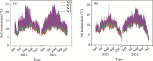 Fig. 1 Soil (a) and air (b) temperature variations under different warming treatments from 2023 to 2024. W0, no warming; W1, air temperature increased by 0.47°C or soil temperature increased by 0.61°C; W2, air temperature increased by 0.92°C or soil temperature increased by 1.09°C; W3, air temperature increased by 1.44°C or soil temperature increased by 1.95°C. The abbreviations are the same as in the following figures and tables.