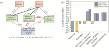 Fig. 5 Structural equation model (SEM) illustrating the effects of climate warming and nitrogen deposition on the stability of plant community biomass (a) and standardized total, direct, and indirect effects of climate warming and nitrogen deposition on the stability of plant community biomass (b). *, P<0.050 level; **, P<0.010 level; ***, P<0.001 level. CFI, comparative fit index; RMSEA, root mean square error of approximation; AIC, Akaike information criterion.