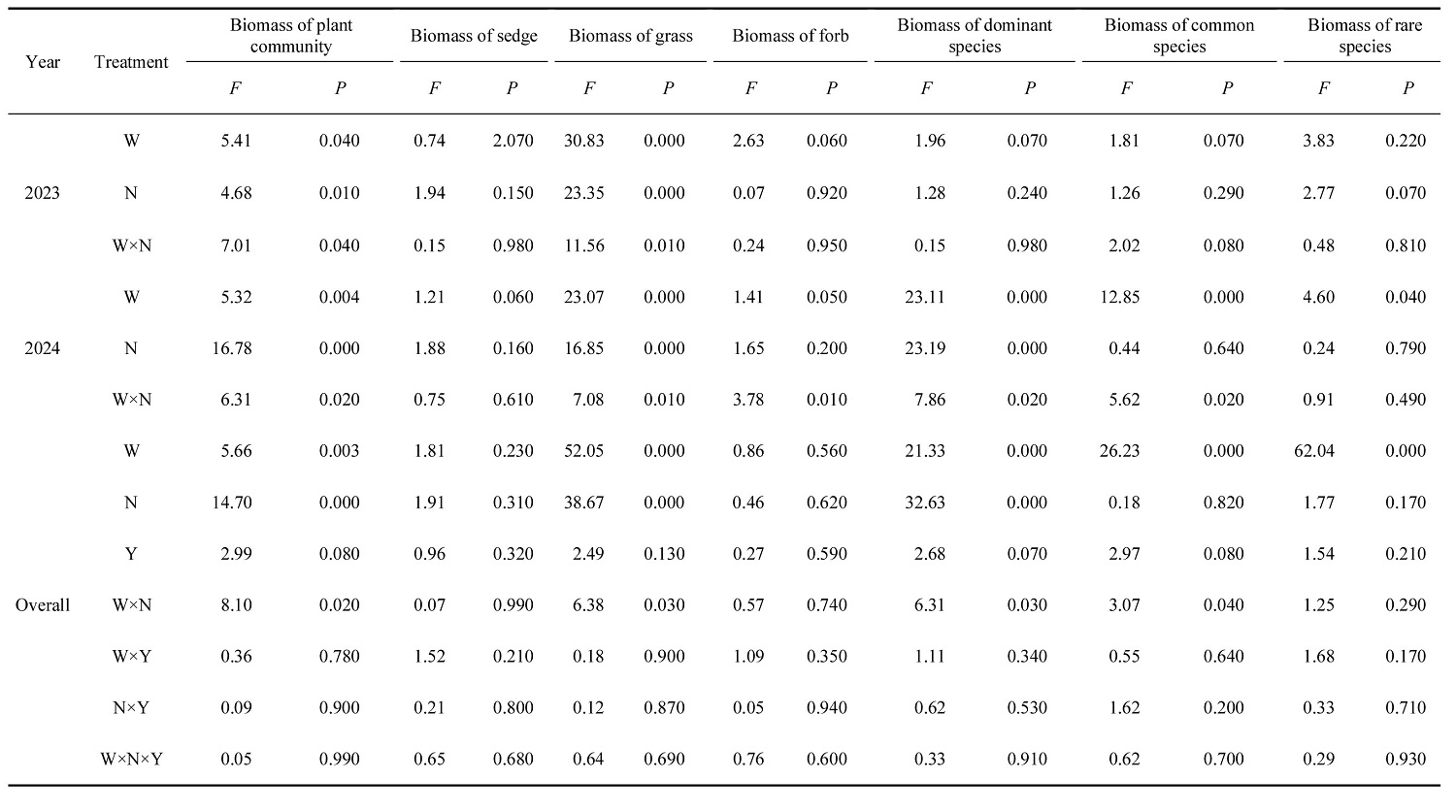 Table S1 Results of linear mixed-effects model assessing the independent and interactive effects of climate warming (W), nitrogen deposition (N), and year (Y) on plant biomass