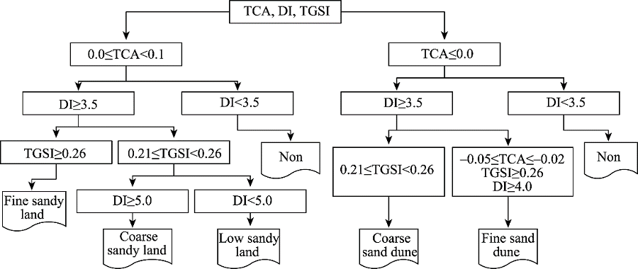 Decision tree for classifying sandy lands using tasseled cap angle (TCA), disturbance index (DI), and topsoil grain size index (TGSI)