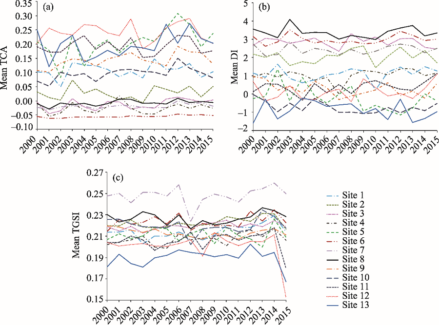 Dynamic changes of TCA, DI and TGSI values of the thirteen sites from 2000-2015