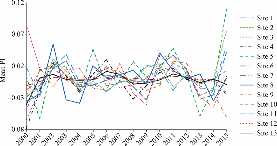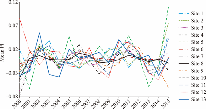 Dynamic changes of the process indicator (PI) values of the thirteen sites from 2000-2015
