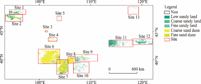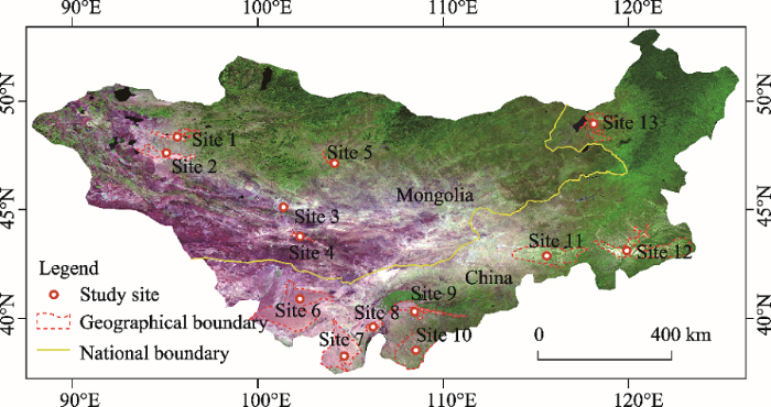 The MP is located in the hinterland of temperate Asia and has a total population of about 2.8×107 (0.3×107 for Mongolia and 2.5×107 for IMAR in 2015; Fang et al., 2015). It is dominated by steppe vegetation, including meadows, and typical and desert steppe vegetation (Zhao et al., 2015). It has a hyper-continental climate. The highest annual mean temperature appears in the desert steppe (1.2°C in Mongolia and 5.3°C in the IMAR) and the lowest annual mean temperature is -1.1°C in the desert steppe of Mongolia and 1.9°C in the desert steppe of IMAR (Fang et al., 2015; Zhao et al., 2015). The wind blows from between the northwest and the west for most of the year (Yao et al., 2007; Li, 2011; Karnieli et al., 2014; Lamchin et al., 2016). There are deserts of Badain Jaran, Tengger, Ulan Buh, and Hobq, and sandy lands of Mu Us, Otindag, Horqin, and Hulun Buir in the IMAR (Zha and Gao, 1997; Kawamura and Akiyama, 2010). The Gobi is a vast, large desert region situated on the MP, and covers parts of northern IMAR and southern Mongolia. This study was carried out in Khar Nuur Sand Dune (Site 1), Ereen Nuur Sand Dune (Site 2), Tsagan Nuur Sand Dune (Site 3), Khongoryn Els Sand Dune (Site 4), Khar Khorin and Bayan Gobi (Site 5), Badain Jaran Desert (Site 6), Tengger Desert (Site 7), Ulan Buh Desert (Site 8), Hobq Desert (Site 9), and Mu Us Sandy Land (Site 10), Otindag Sandy Land (Site 11), Horqin Sandy Land (Site 12), and Hulun Buir Sandy Land (Site 13) in the MP (Fig. 1).