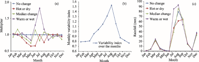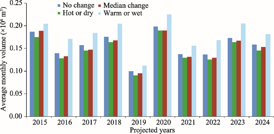 EPA suggested four climate conditions for both the near and far-term projections (Rossman, 2013). The scenarios are (1) no change, (2) hot or dry, (3) median change, and (4) warm or wet (Fig. 3a). For the analyses, the near-term (from 2020 to 2049) projected values were used. In the baseline scenarios (BLSs; explained in section 4.1), against which the controlled/modified scenarios were compared, no change in climate was considered. However, for further analysis, the median change in climate was selected in order to compare the changes.