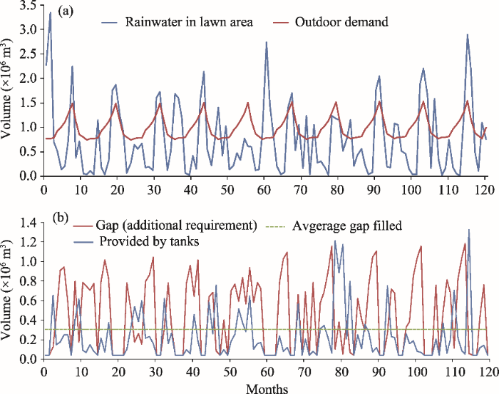 A 4.0-m3 tank was chosen in this study to evaluate the dynamics of the RWH tanks, which was large enough to store the average water generated from a rooftop in a month in Arizona. If a particular month experienced enough rainfall to meet the outdoor water demand, i.e., if the total volume of water generated in the lawn areas were greater than the total outdoor water demand, then no water was drawn from the tanks. During the months when rainfall was not enough to meet the outdoor demand, the required amount (i.e., the gap/difference between the demand and the water from rainfall) was drawn from the tanks, which sometimes resulted in the emptying of the tanks. During the projected 10 years (120 months), 37 instances (30%) were found where no water was required from the tanks, suggesting that the monthly total rainfall alone was sufficient to meet the monthly outdoor water demand (Fig. 7a). For the remaining months, when a gap was present, water from the storage tanks was drawn. The percentage gap filled by the water stored in the tanks varied from 0.86% to 100% (on 15 occasions out of the 120 months). The average monthly gap filled by the tank water was found to be 27% over the projected years (Fig. 7b). Several tank sizes were tested to suggest a tank size that can be considered feasible. Tank sizes ranging from 1.0-2.0 m3 were found to store close to 80% of the water generated from the rooftops each month under various climate conditions in Arizona.