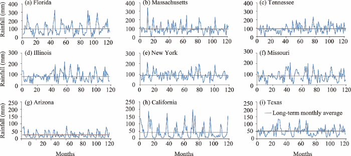 Monthly rainfall variation of the selected U.S. states from January 2005 to December 2014