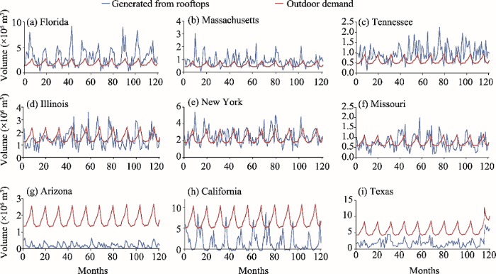 The percentage of CMPCD used to meet the outdoor demand, the percentage of the population living in households with desert landscaping, and the reduction factor due to antecedent dry period had a unique set of values for each state. The percentages of CMPCD were set to values that would slightly over-estimate the demand (Table 2). The WaterSense program of the EPA (www.epa.gov/watersense) suggests that, on an average, 30% of the per capita water demand is used for outdoor water purposes across the U.S., which can be as high as 60% in the south-western arid regions (e.g., Arizona, California, and Texas). The percentage of population living in the households with desert landscaping was set to zero in the BLSs for all the states except for the arid states since the remaining states had more than 100 mm of long-term average precipitation per month (Fig. 2). Also, the reduction factor due to antecedent dry period was close to 1.0 (suggesting no reduction) for the states with enough and frequent rainfall (Table 2). The values were set according to the location and climate of the states based on the SCS curve number (Yuan et al., 2014). Graphical outcomes of the BLSs are presented in Figure 4. In the BLSs, it was observed that many states, especially the ones with enough and frequent rainfall, could meet the outdoor water demand quite effectively by RRWH (Table 3). Though four of the nine states chosen met the total outdoor water demand from RRWH in terms of the total volume over the projected years (Table 3), none of the states was able to meet the demand all year round, on a monthly basis, as the seasonal effects influenced both the rainfall and outdoor water demand (Fig. 4). Florida, Massachusetts, and Tennessee showed good responses; RRWH was able to meet the outdoor water demand during most of the months in these states. The demands were met during some of the months for Illinois, New York, and Missouri; however, these states were short of the target demand during a few months in summer. Arizona, California, and Texas showed the poorest performances in terms of meeting the water demand. California and Texas had only a few instances, on a monthly basis, where RRWH was able to meet the outdoor water demand; Arizona did not show a single instance in meeting the water demand during the entire projected period in the BLS.