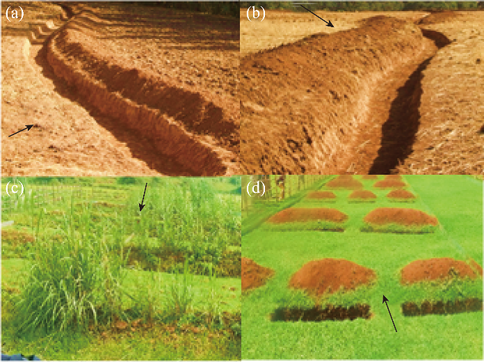 Commonly implemented soil and water conservation measures for the major land use typesin the three agro-ecology systems in the Upper Blue Nile Basin of Ethiopia.(a), soil bunds; (b),Fanyajuu in cultivated land; (c),soil bunds combined with planting of vegetation (here, elephant grass) in cultivated land; and (d), short trenches in grazing land. Thearrows indicate the slope direction.