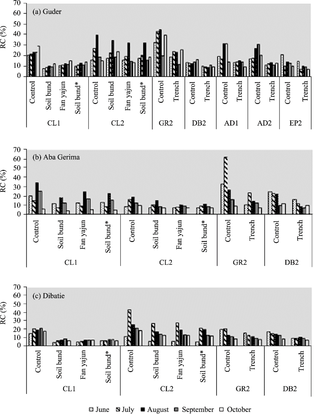 The percentage of seasonal rainfall lost as runoff from control plots in the Guder watershed ranged from 14% to 36%, versus 18% to 40% at Aba Gerima and 14% to 23% at Dibatie (Table 3), demonstrating the high variability of RC across the three studied environments.RCalso differed between the control and treatment plots at each site.
