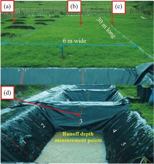 Layout of the runoff plots established in grazing land in the Guder watershed.(a), plots with soil and water conservation measures; (b), plots without conservation measures; (c), corrugated iron sheets inserted in the ground to a depth of 15 cm to establish the plot boundaries; (d), runoff collection pit lined with impermeable geomembrane plastic. Water depth was measured at the six numbered points (1-6) on the liner (Sultan et al., 2017), with the point No. 6 in the opposite side of No. 3.