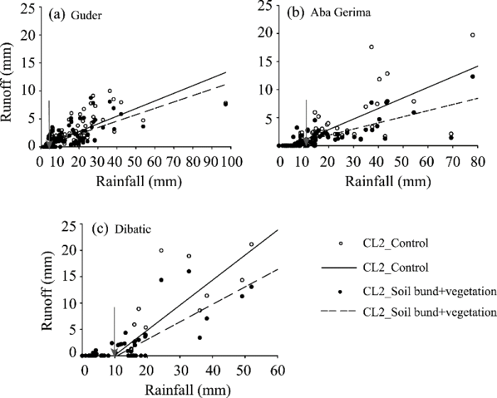 The response of runoff to rainfall at the moist subtropical site (Guder) began sooner (i.e., a lower rainfall threshold) than that at the humid subtropical (Aba Gerima) and the tropical hot humid (Debatie) sites (Table 4). Sultan et al. (2017) reported that Guder receives long-lasting rainfall events with small amounts of rainfall, and yet that this site has a longer rainy season than other sites in the western and central highlands; nonetheless, the higher proportion of rainfall (63%) that comes from light rainfall events, which influences subsequent availability of soil moisture. In addition, the heavy soils of the Guder watershed (Table 1) tend to retain moisture for a longer period, and this can lower the threshold rainfall compared with other sites. Therefore, small increases in precipitation could result in waterlogging and damage to soil and water conservation structures if subsequent precipitation occurs as intense storms that deposit more rain than the threshold value.