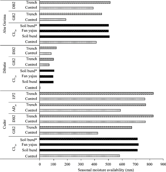 The combination of the distinctive features of the agro-ecology system, of the soil and water conservation practices, and of the associated hydrological processes affected the seasonal water availability in the plots (Fig. 6). The seasonal potential evapotranspiration values were 579, 675, and 732 mm for the Guder, Dibatie, and Aba Gerima sites, respectively, which were determined by the Hargreaves and Samani (1985) equation. The soil water availability (Fig. 6) obtained by means of the water-balance method ranged from 428 to 830, 394 to 515, and 7 to 124 mm for the Guder, Aba Gerima, and Dibatie sites, respectively. The differences in these ranges can be attributed to differences in the frequency of rainfall (amount), soil type, runoff amount (Table 3), and potential evaporation among the different agro-ecologysystems. On average, implementation of soil and water conservation measures increased seasonal water availability by about 139 mm compared with the control plot at the Guder site, versus 130 and 67 mm at the Aba Gerima and Debatie sites,respectively (Fig. 6). This indicates that the infiltration and runoff dynamics were also influenced by slope length, because the reduction of slope length caused by installation of the conservation structures increased storage and thereby reduced the volume of runoff.